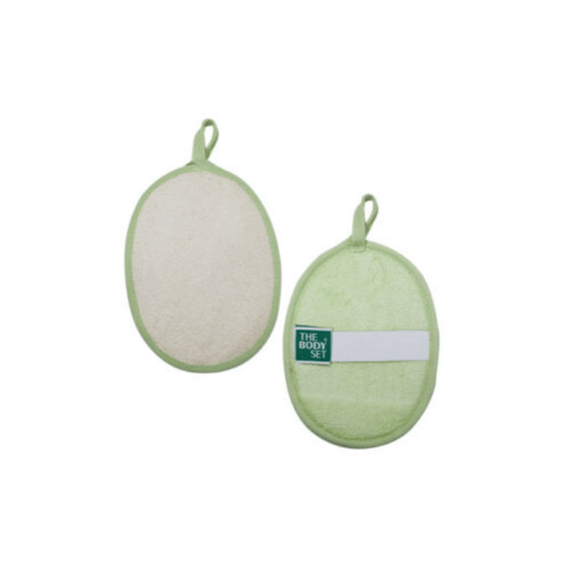 A natural exfoliating back strap made from green bamboo, fiber, and loofah, ideal for deep cleansing hard-to-reach areas.