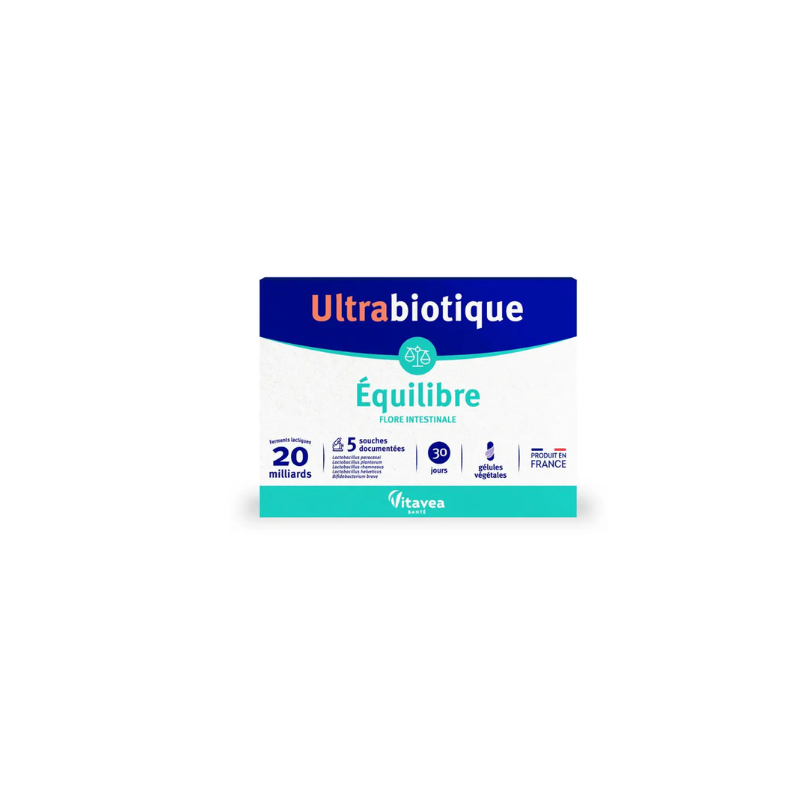Ultrabiotic Balance is a food supplement providing a complementary association of the best strains of lactic ferments. The synergy of the 5 scientifically documented strains and the high dosage of 20 billion of these lactic ferments make it possible to participate in the natural balance of transit, to fight against situations of intestinal discomfort (bloating, flatulence, etc.) and to support immunity.